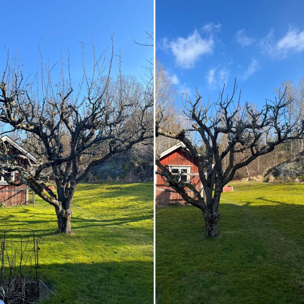 Nu och fram till savning eller ända fram till knopparna sväller är en bra tid att beskära träden. Med undantag av Stenfruktträd som plommon, körsbär och persika. Vinterbeskäring stimulerar tillväxt och främjar fruktsättning, särskilt för äpple och päronträd. Vinterbeskärning, då när trädet är avlövat gör det lättare att se kronans struktur och beskära trädet för optimalt ljusgenomsläppande effekt. Vilket i sin tur ger dig större och välmående god frukt. Att vinterbeskära träden innan det gör sig redo för vår innebär också att men minskar risken att smittas av sjukdomar och svampangrepp.